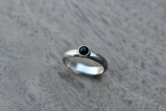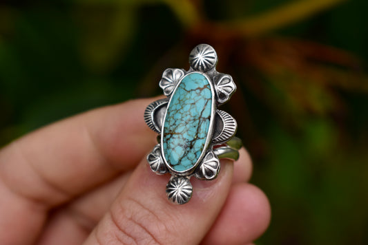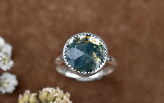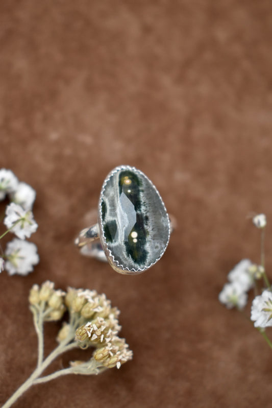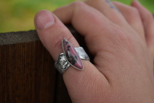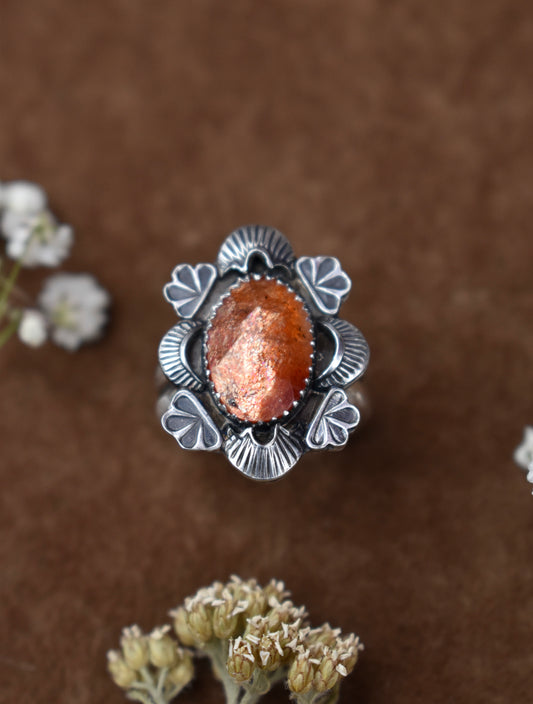 Rainbow Moonstone Stamped Ring with Salmon Band Size 8.5