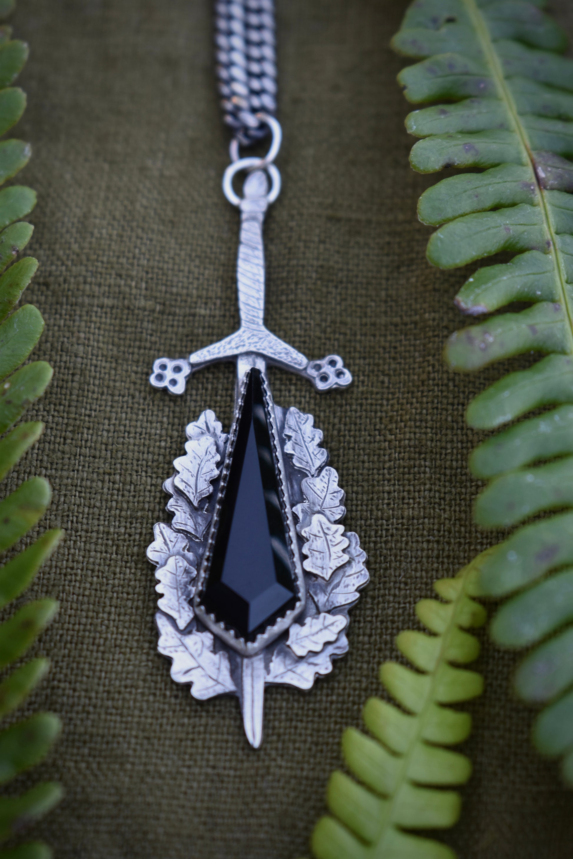 A Claymore, trapped forever in the embrace of a beautiful black onyx and surrounded by delicate sterling silver oak leaves. This piece comes on an 18" long sterling silver curb chain- please let me know if you'd like a different length chain.