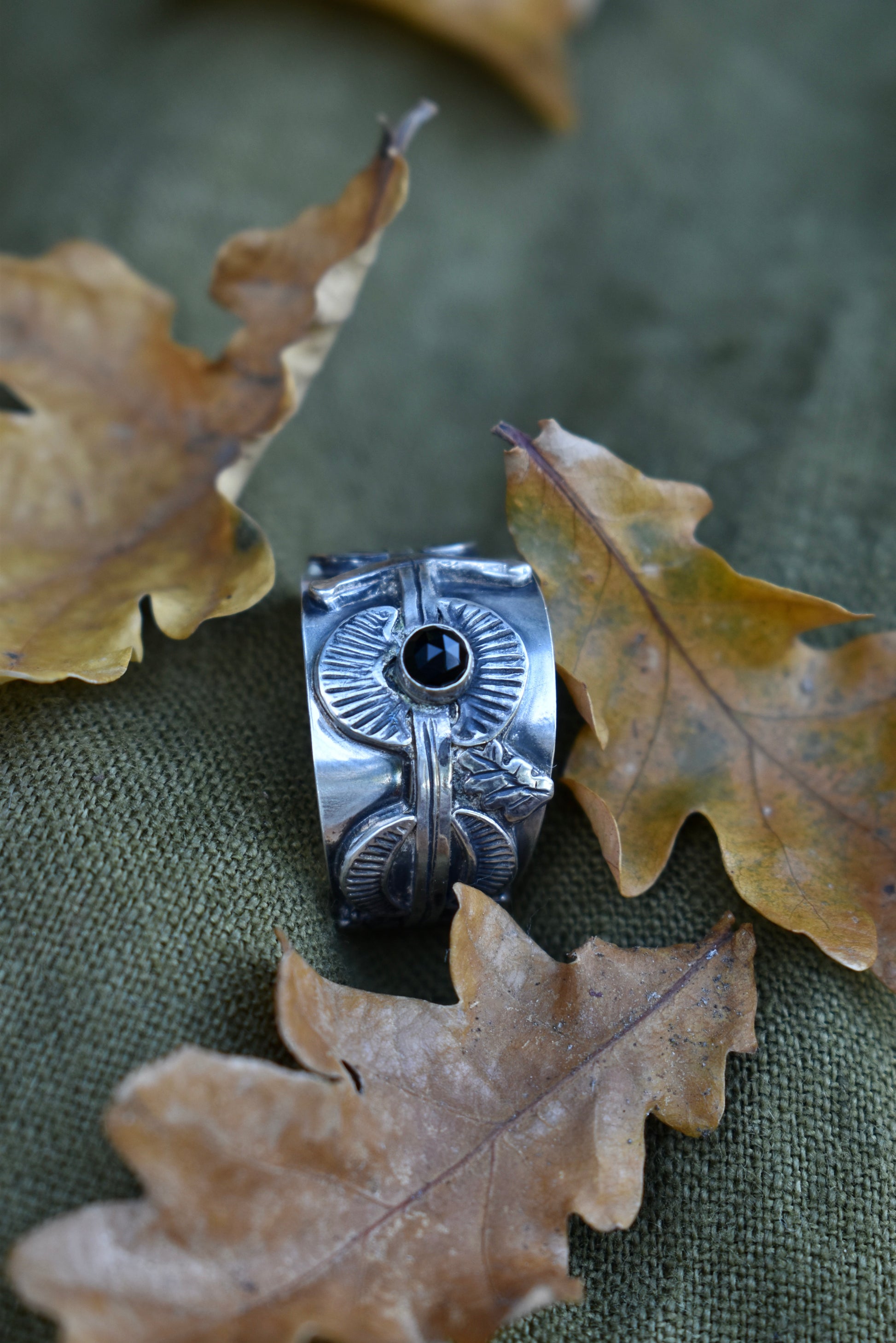 This ring is a size 10 as is but is adjustable to a smaller or slightly larger size. Thick banded and made in sterling silver with sword, oak leaf, and stamped embellishments. Comes with a small black onyx stone.