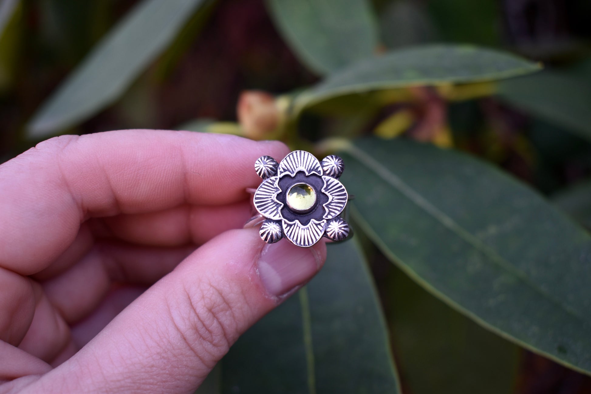 A pretty and tough ring with bright green peridot encircled by hand stamped embellishments and a thick band with a silhouette of a salmon. Handmade entirely by yours truly. Size 9.5-9.75.