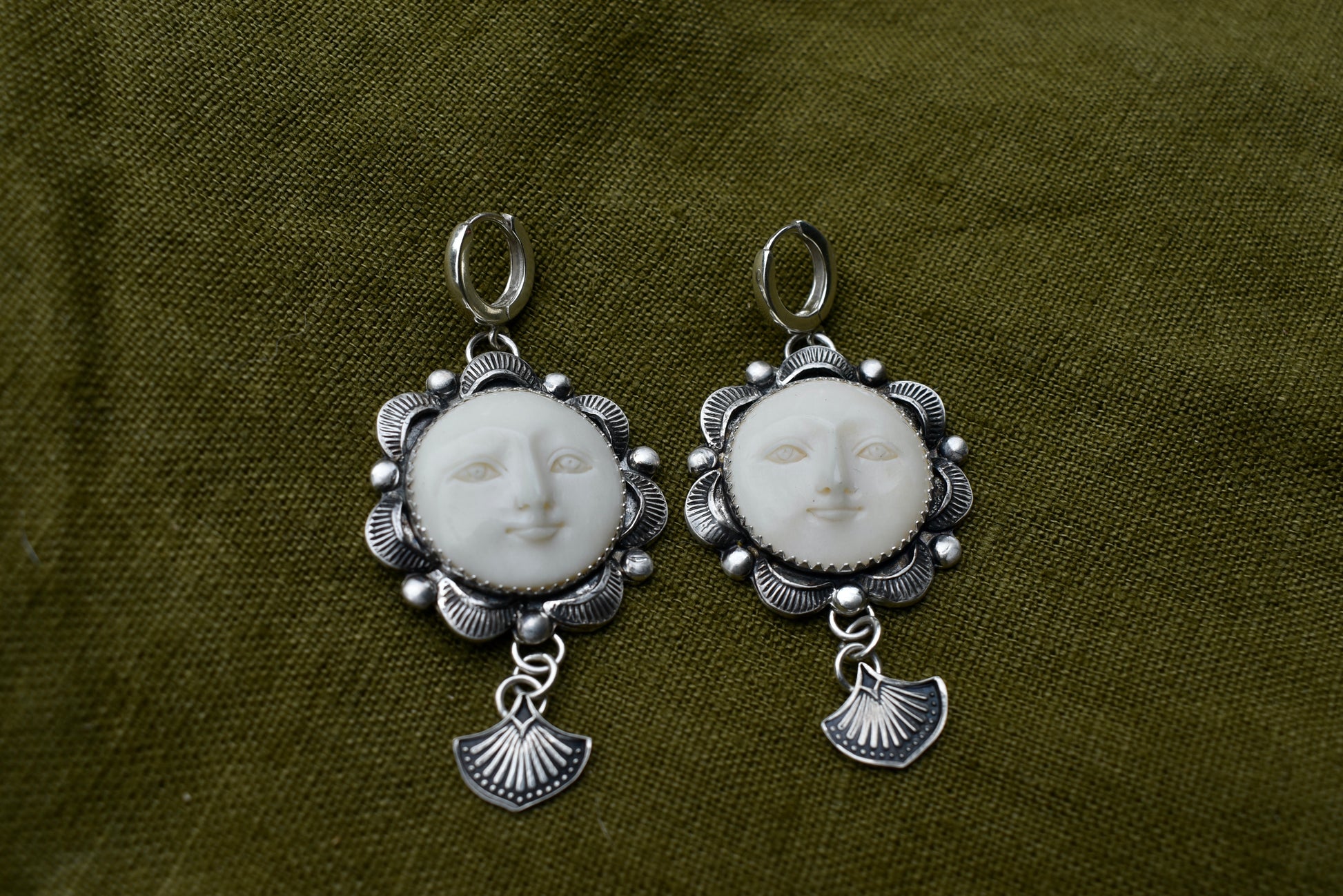 Handmade from sterling silver with hand carved bovine bone moon faces. These earrings come with sterling silver huggie earrings.
